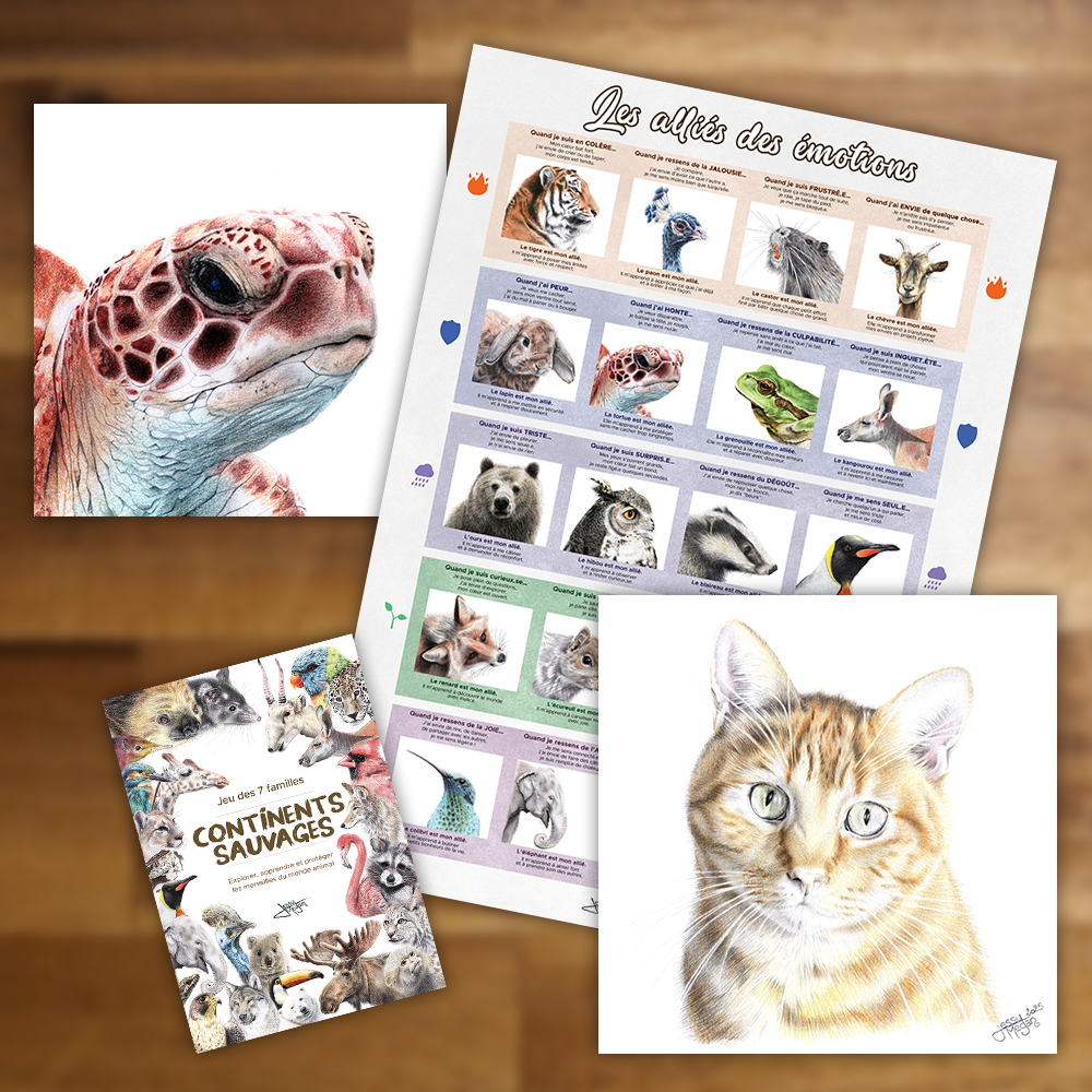 Certaines créations issues de cette démarche sont également disponibles dans la boutique d’art animalier engagé.